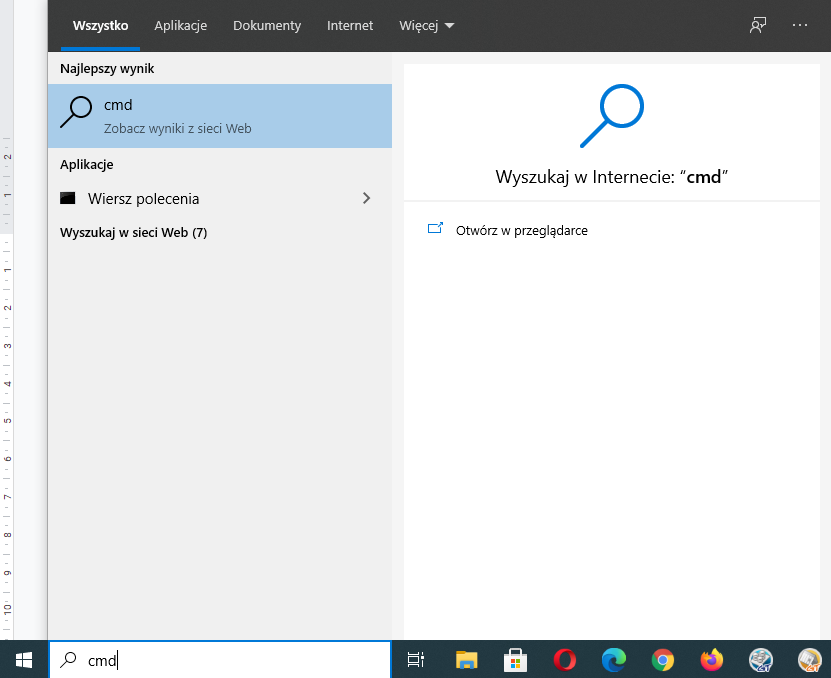 Wskazówka: Jeżeli nie znamy ustawień sieci, możemy je sprawdzić na naszym komputerze. W tym celu uruchamiamy wiersz poleceń: W polu wyszukiwarki Windows wpisz “cmd” i uruchom “Wiersz polecenia”.