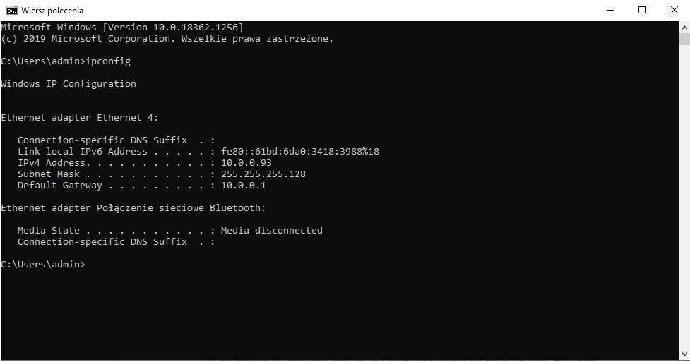 Następnie w samym wierszu wpisujemy polecenie “ipconfig“ i potwierdzamy ENTER. Jako wynik otrzymujemy dane naszej sieci lokalnej (IP, bramę, maskę), których możemy użyć podczas konfiguracji sieci. Pamiętajmy tylko aby numer IP, który konfigurujemy w drukarce, różnił się o jedno oczko np. jeśli dane naszej sieci 10.0.0.93 ustawmy w drukarce 10.0.0.94. W przypadku wystąpienia problemów, w ustawieniach routera musimy sprawdzić czy dany IP nie jest już zarezerwowany i w razie konieczności ustawić inny np: 10.0.0.95.