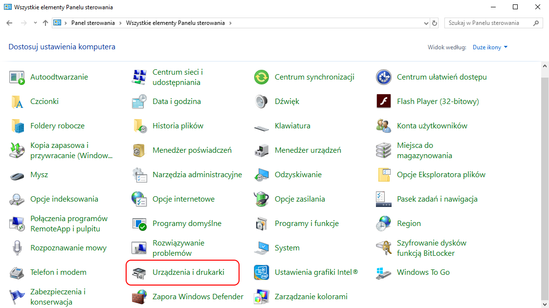 Jeżeli nasza drukarka została już skonfigurowana do pracy w siec, możemy pominać krok nr. 1 i przejść do jej instalacji w systemie Windows. Aby to zrobić musimy uruchomić Panel sterowania, następnie odnaleźć ikonę z nazwą Urządzenia i drukarki. Naszym kolejnym krokiem będzie już dodanie samego urządzenia. W tym celu klikamy w odpowiedni przycisk menu “Dodaj drukarkę”.