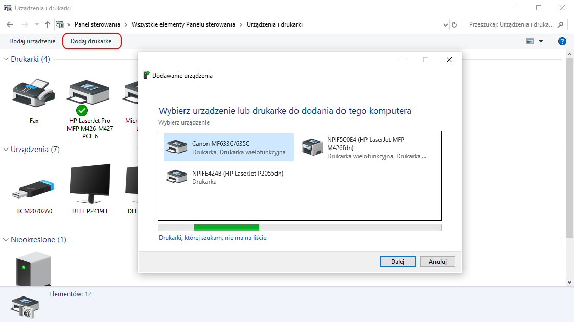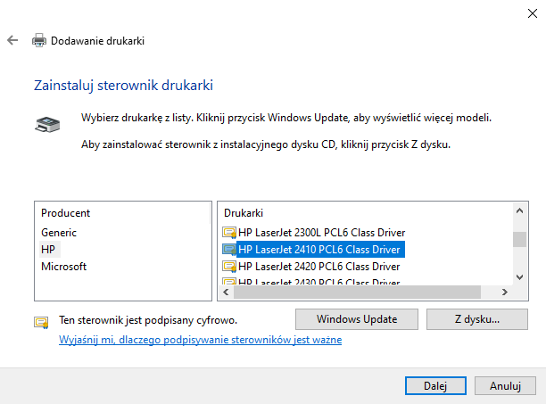 Jeśli skonfigurowaliśmy urządzenie poprawnie, powinno pojawić się ono na liście dostępnych drukarek. Wybieramy interesujący nas model i klikamy “Dalej”. Nasza drukarka zostanie automatycznie zainstalowana przez system Windows.