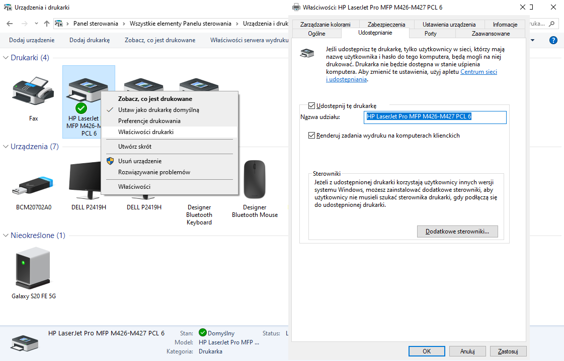 W Panelu sterowania, w opcjach “Drukarki i skanery”, musimy odszukać nasze zainstalowane wcześniej urządzenie. Następnie prawym przyciskiem myszy, wywołujemy jego menu. Odnajdujemy w nim “Właściwości drukarki”. W kolejnym kroku w sekcji “Udostępnianie” zaznaczamy “Udostępnij drukarkę”, a także “Renderuj zadania wydruku na komputerach klienckich”. Klikamy Zastosuj, OK i gotowe!. Nasza drukarka została właśnie udostępniona w sieci. W celu zainstalowania jej na komputerach w sieci, postępujemy analogicznie jak w przypadku punktu drugiego w tym poradniku, dotyczącego instalacji drukarki LAN. Jedyne ograniczenie, o którym musimy pamiętać to takie, że w przypadku tego rozwiązania aby możliwe było drukowanie na komputerach w naszej sieci, urządzenie do którego podłączona jest udostępniona drukarka musi pozostać włączone.