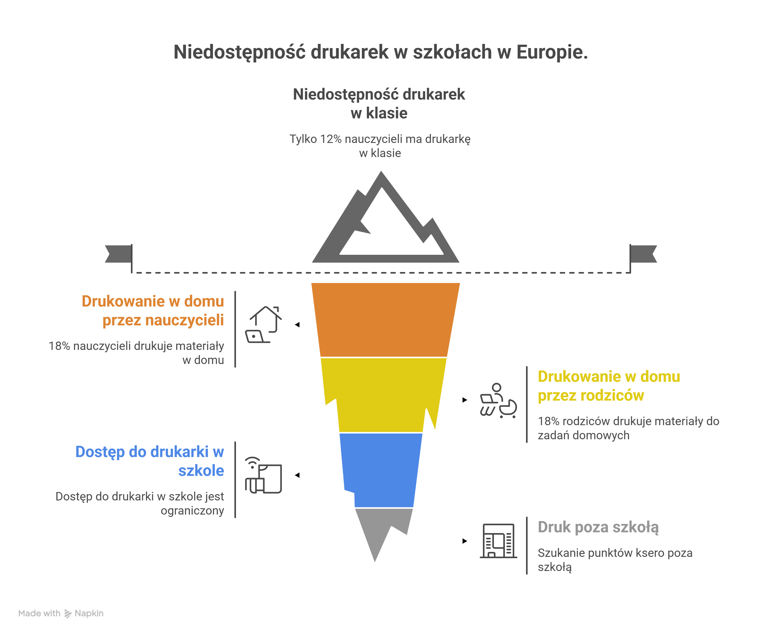 Co w pozostałych przypadkach? Wielu z nas swego czasu zapewne stało w kolejce do kantorka, by skorzystać (często za opłatą) z drukarki udostępnianej uczniom i nauczycielom. W zależności od rozmiaru i budżetu szkoły czy uczelni może to być jedna, czasem kilka drukarek na budynek czy wydział, w którym uczą się i pracują setki osób. Ci, którzy mieli mniej szczęścia, musieli szukać pobliskiego punktu ksero poza placówką. Dane zebrane przez Epson sugerują, że problem dotyczy nie tylko Polski - pomimo zapotrzebowania ze strony nauczycieli i rodziców, drukarek w szkołach brakuje w całej Europie.