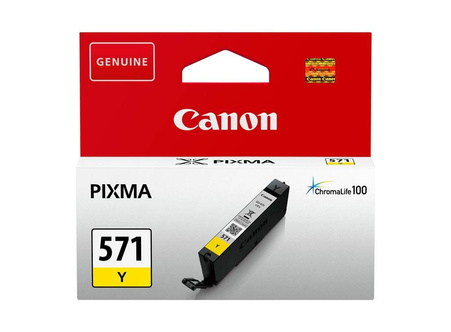 Tusz oryginalny Canon o symbolu CLI-571Y / 0388C001. Wydajność 350 stron. Produkt pochodzący z oficjalnej dystrybucji marki Canon. W opakowaniu znajduje się 1 sztuka drukująca w kolorze żółtym.