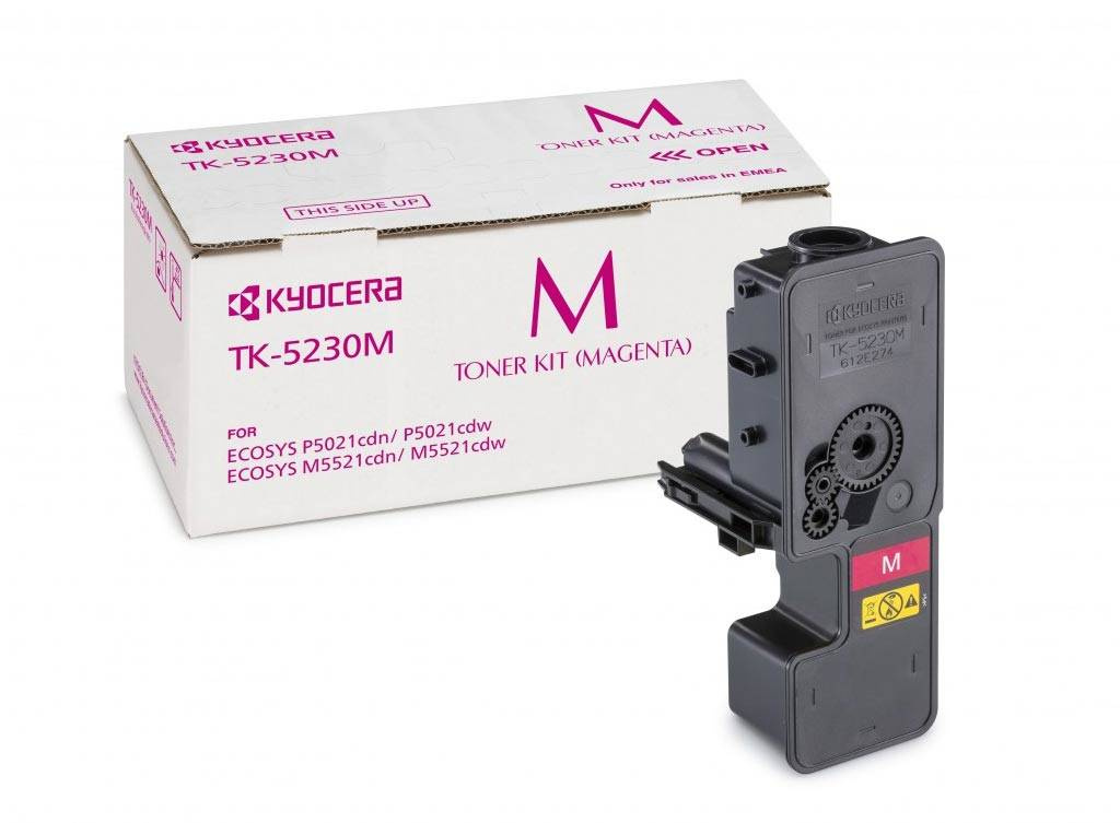 Toner oryginalny Kyocera o symbolu TK-5230M / 1T02R9BNL0. Wydajność 2200 stron. Produkt pochodzący z oficjalnej dystrybucji marki Kyocera. W opakowaniu znajduje się 1 sztuka drukująca w kolorze magenta.