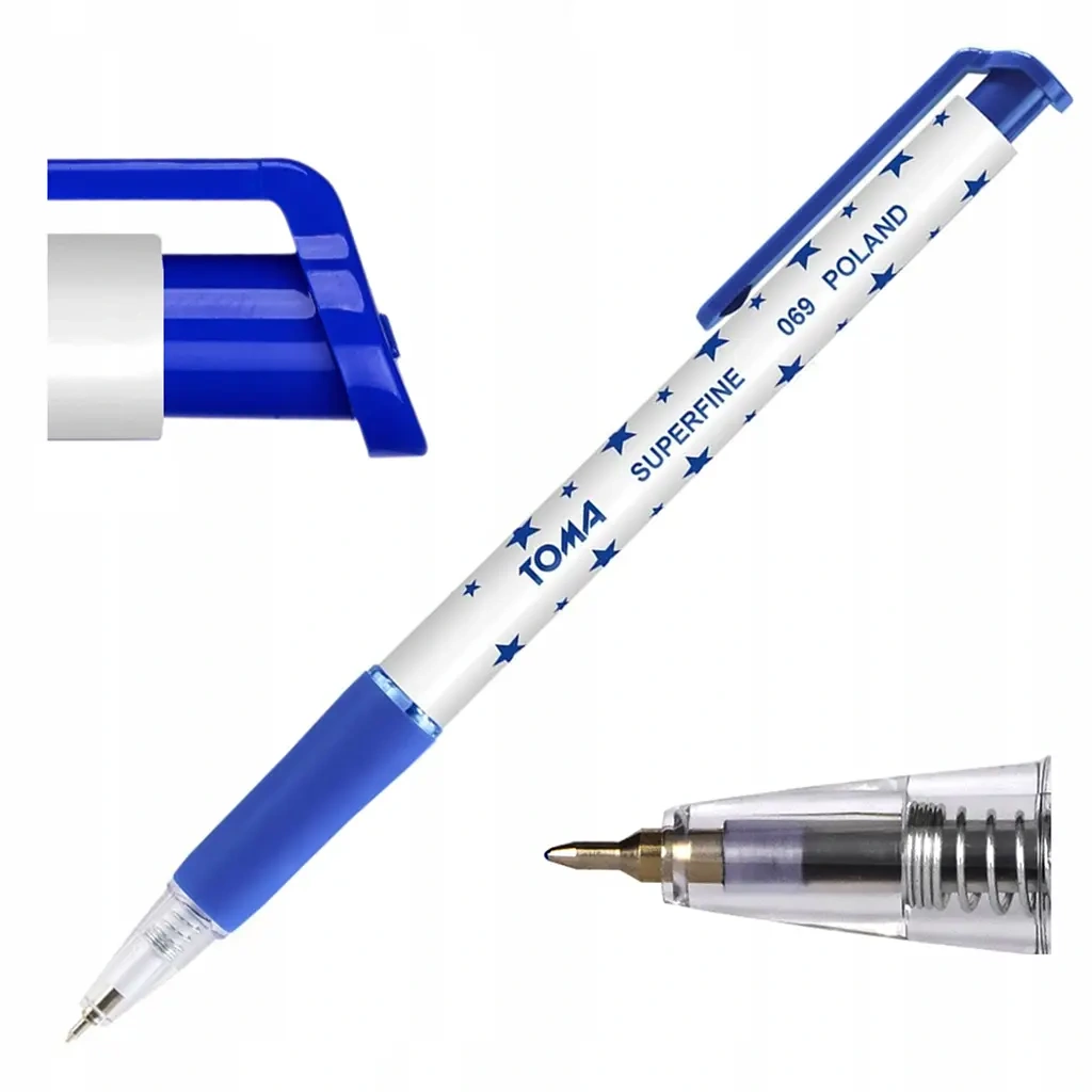 Prezentowany produkt to długopis automatyczny marki Toma, model TO-069 Superfine. Jest to narzędzie piśmiennicze zaprojektowane dla osób ceniących wyjątkową precyzję oraz komfort użytkowania. Długopis charakteryzuje się nowoczesnym wzornictwem z plastikową obudową ozdobioną motywem w gwiazdki. Wyposażony jest w trwałą kulkę wykonaną z węglików spiekanych wolframu o średnicy 0.5 mm, co pozwala na kreślenie bardzo cienkich i dokładnych linii. Zastosowanie szwajcarskiej technologii wkładu Floating Ball firmy Premec gwarantuje płynność pisania oraz niezawodny przepływ tuszu w kolorze niebieskim.