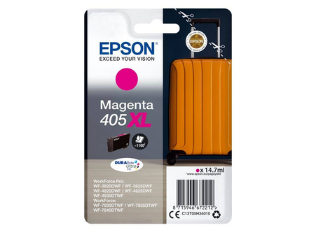 Tusz oryginalny Epson o symbolu 405XL / C13T05H34010. Wydajność 1100 stron. Produkt pochodzący z oficjalnej dystrybucji marki Epson. W opakowaniu znajduje się 1 sztuka drukująca w kolorze magenta.