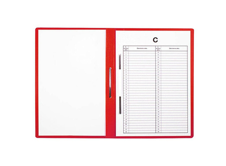 Skoroszyt akt osobowych wykonany z folii PVC, przód i tył twardy kolorowy, boczna perforacja umożliwiająca wpięcie do segregatora z dowolnym ringiem. W środku cztery zakładki z blaszką i wąsem, papierowy wkład A, B, C, D. Wymienny, papierowy pasek do opisu na grzbiecie, dwa wycięcia ułatwiające wysuwanie paska. Zaokrąglone rogi obu okładek, format A4, kolor: czerwony.