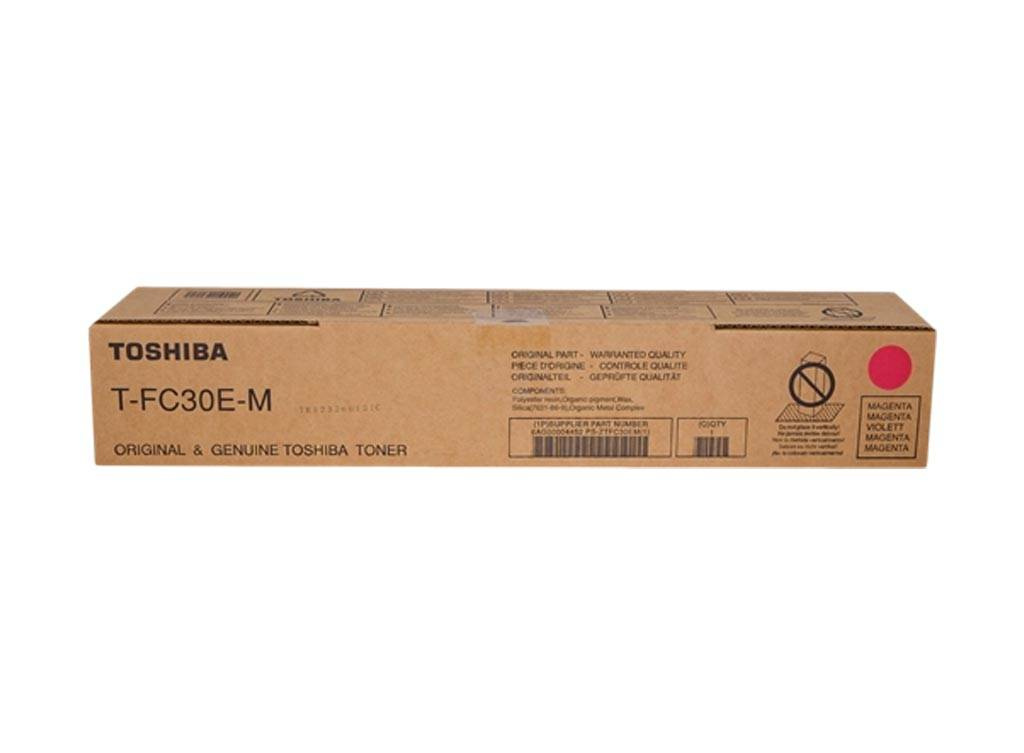 Toner oryginalny Toshiba o symbolu T-FC30EM / 6AJ00000097. Wydajność 33600 stron. Produkt pochodzący z oficjalnej dystrybucji marki Toshiba. W opakowaniu znajduje się 1 sztuka drukująca w kolorze magenta.