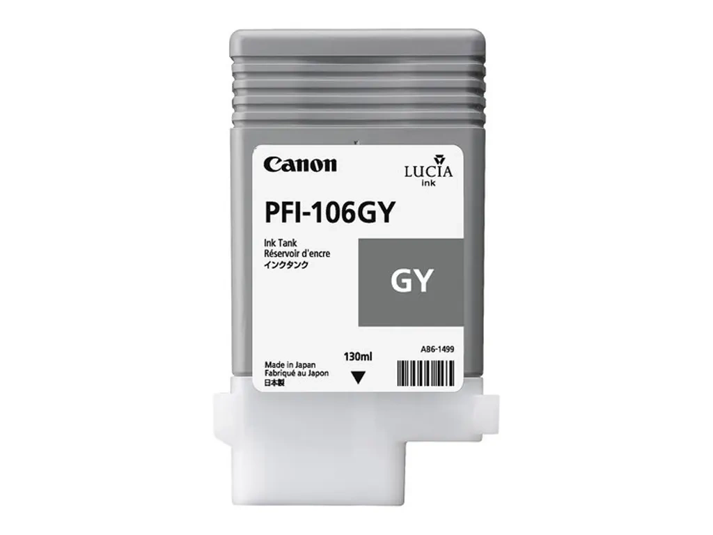 Tusz oryginalny Canon o symbolu PFI-106GY / CF6630B001AA. Pojemność 130 mililitrów. Produkt pochodzący z oficjalnej dystrybucji marki Canon. W opakowaniu znajduje się 1 sztuka drukująca w kolorze szarym.