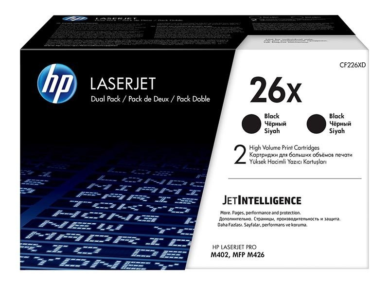 Toner oryginalny HP, dwupak o symbolu 26X / CF226XD. Wydajność 18000 stron (2x 9000 stron). Produkt pochodzący z oficjalnej dystrybucji marki HP. W opakowaniu znajdują się 2 sztuki drukujące w kolorze czarnym.