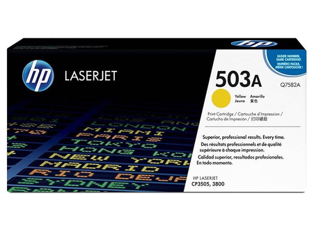 Toner oryginalny HP o symbolu 503A / Q7582A. Wydajność 6000 stron. Produkt pochodzący z oficjalnej dystrybucji marki HP. W opakowaniu znajduje się 1 sztuka drukująca w kolorze żółtym.