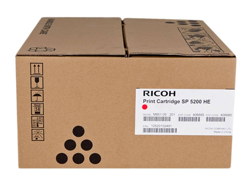 Toner oryginalny Ricoh o symbolu SP 5200HE / 406685. Wydajność 25000 stron. Produkt pochodzący z oficjalnej dystrybucji marki Ricoh. W opakowaniu znajduje się 1 sztuka drukująca w kolorze czarnym.