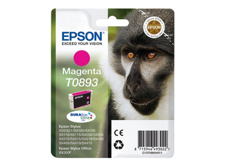 Tusz oryginalny Epson o symbolu T0893 / C13T08934011. Wydajność 135 stron. Produkt pochodzący z oficjalnej dystrybucji marki Epson. W opakowaniu znajduje się 1 sztuka drukująca w kolorze magenta.