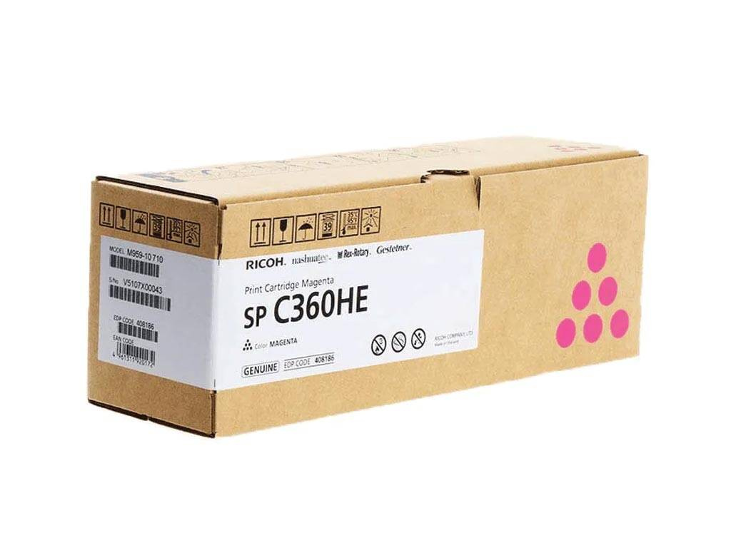 Toner oryginalny Ricoh o symbolu SP C360HE / 408186. Wydajność 5000 stron. Produkt pochodzący z oficjalnej dystrybucji marki Ricoh. W opakowaniu znajduje się 1 sztuka drukująca w kolorze magenta.