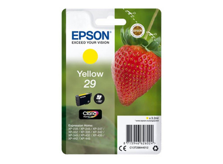 Tusz oryginalny Epson o symbolu 29 / T2984, C13T29844012. Wydajność 180 stron. Produkt pochodzący z oficjalnej dystrybucji marki Epson. W opakowaniu znajduje się 1 sztuka drukująca w kolorze żółtym.