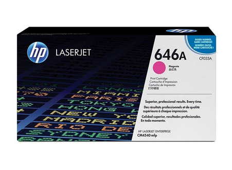 Toner oryginalny HP o symbolu 646A / CF033A. Wydajność 12500 stron. Produkt pochodzący z oficjalnej dystrybucji marki HP. W opakowaniu znajduje się 1 sztuka drukująca w kolorze magenta.