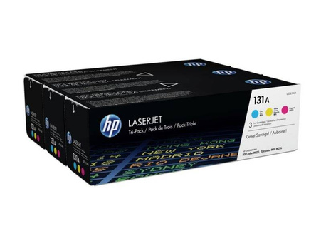 Tonery oryginalne HP, trzypak o symbolu 131A / U0SL1AM. Wydajność 5400 stron (3x 1800 stron). Produkt pochodzący z oficjalnej dystrybucji marki HP. W opakowaniu znajdują się 3 sztuki drukujące w kolorze niebieskim, magenta oraz żółtym.